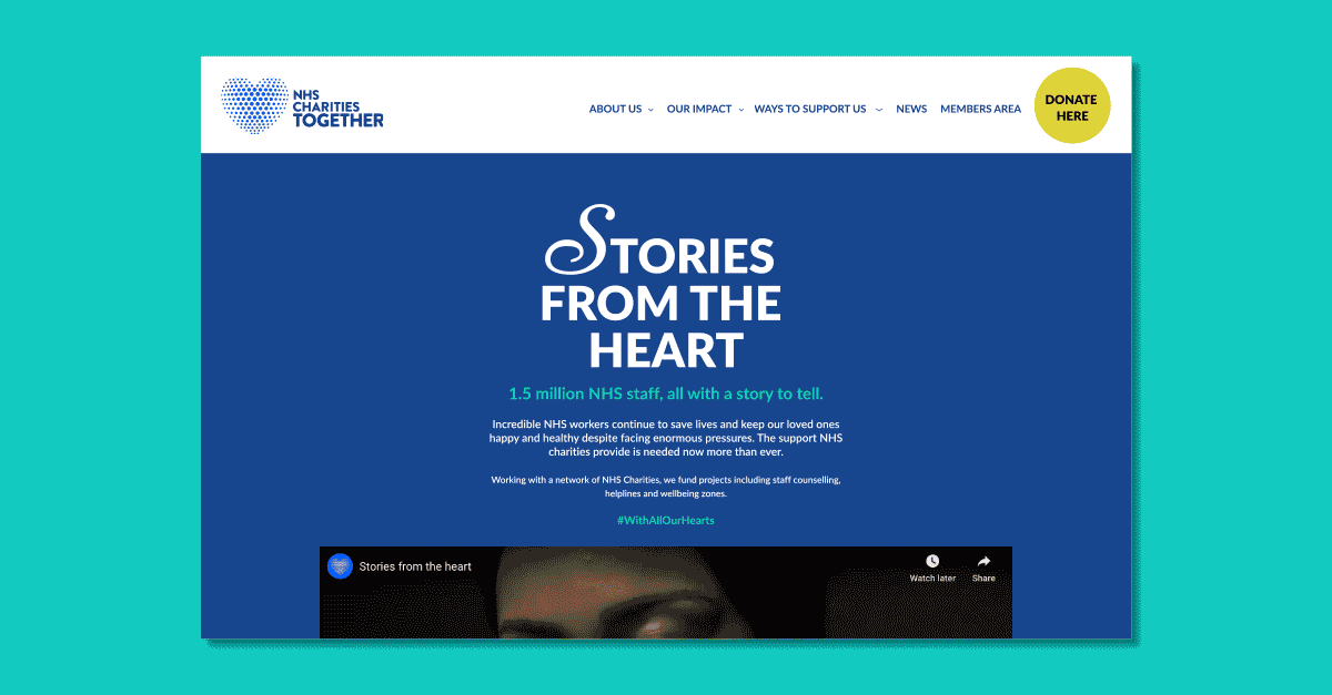 Building on existing staff and trust case studies, we developed #WithAllOurHearts: Stories from the Heart. The campaign was designed to bring those stories to life and show the difference NHS Charities make to staff wellbeing. At its centre was a hero film documenting the pressures NHS staff face, alongside the support made possible through charity funding. This was supported by a dedicated landing page and a suite of organic and paid social content focusing on individual staff and trust stories.